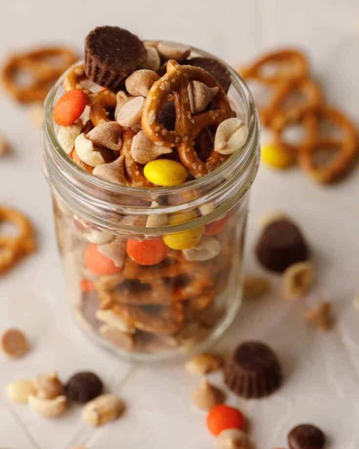 We love to include traditional foods like candy and caramel apples, candy corn, pumpkin bread, and lots of fun-sized candy like Snickers and Reese’s on Halloween night! We also may include a pumpkin-shaped cheeseball and chili if we’re hosting a full meal!
