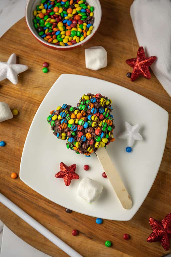 Everyone will love the combination of crispy rice cereal and sweet M&Ms in these colorful candy covered rice krispies treats from Well if She Can Do It. Prepare a batch of treats, then use a Mickey Mouse cookie cutter to create the shape for your treat pops.