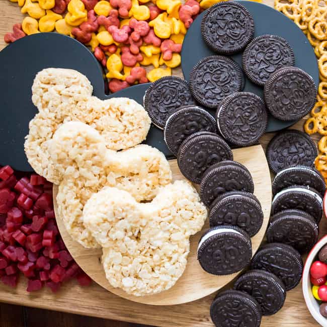 Give your guests a variety of snacks at your party by making a fun snack board! This cute Mickey snack board from a Night Owl Blog features candy, cookies, gummies, and rice krispies treats.