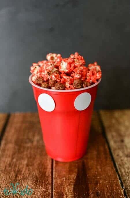 Turn a plain red cup into a snack cup for your Mickey Mouse party, by adding 2 white dots to the cup! This recipe for polka dot Disney popcorn from Tikkido is a sweet and salty treat that everyone at your party is sure to enjoy, and it's such an easy way to make each place setting pop!