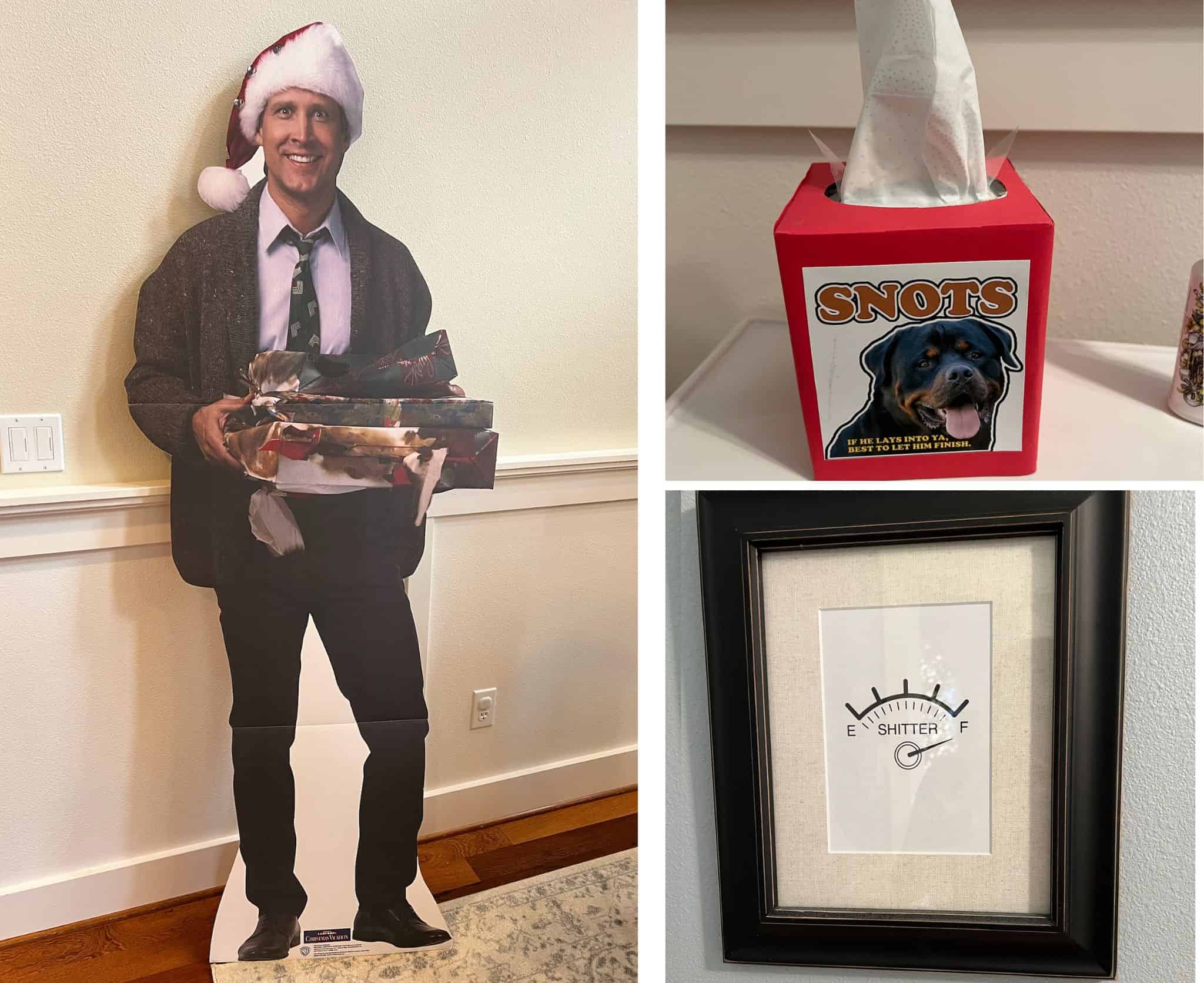 Many of your Christmas decorations will also tie into the theme — like Christmas lights and a real Christmas tree! You can always add in fun extras like these moose mugs, a lit-up faux “fried cat” centerpiece, and a Clark Griswold cutout standup!
